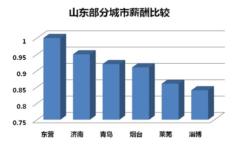 东营是一座年轻的城市,油田是她的命脉。据众达朴信薪酬调研数据显示,东营地区薪酬水平领跑山东,其石油化工等优势产业的带动作用非常明显;以东营地区薪酬水平为基数,济南和青岛的薪酬系数分别为0.95和0.92;烟台薪酬水平接近青岛,薪酬系数为0.91;以钢铁和化工为主要产业的莱芜和淄博近年薪酬涨幅较大,薪酬系数分别为0.86和0.84。