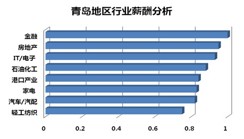 与其他地区一样,金融和房地产行业的薪酬水平领跑全行业。以金融行业薪酬水平为基数,房地产和IT/电子的薪酬系数分别为0.95和0.93;作为青岛地区重点产业发展的石油化工和港口产业,薪酬系数分别为0.88和0.84,;家电是青岛市发展最成熟,在国内具有较高知名度和较强竞争力的行业,薪酬涨幅高于行业平均水平,薪酬系数为0.83,而作为青岛优势产业的纺织和轻工行业受限于行业利润率低的特点,薪酬水平较低,薪酬系数仅为0.75。