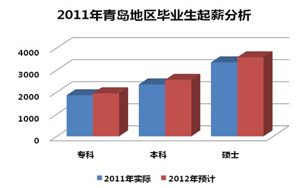 与华东和华南地区二类城市相比,青岛地区的毕业生起薪并不占优势,人才流失严重,根据众达朴信监控数据显示,2011年青岛地区本科和硕士毕业生起薪分别为2350元和3350元,本科毕业生起薪低于北京1000多元;2012年起薪预计增长近10%,本科毕业生起薪将超过2500元。