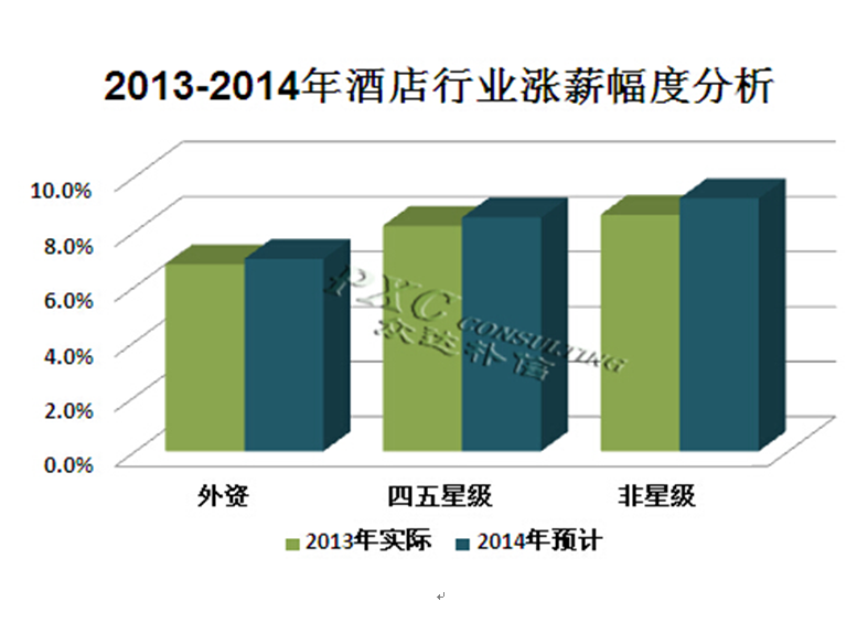 在这个客观背景下,星级酒店的涨薪幅度也不会过高。而非星级酒店尤其是经济型连锁酒店近两年有很快速的发展势头,性价比高只是一个方面,更加接地气的环境和服务才是吸引客户的关键。而经济型连锁酒店的快速扩张,也使本来就不够多的行业人才有了更多的选择。根据众达朴信报告显示,预计2014年非星级酒店整体涨薪幅度超过9%,经济型连锁酒店行业超过10%。
